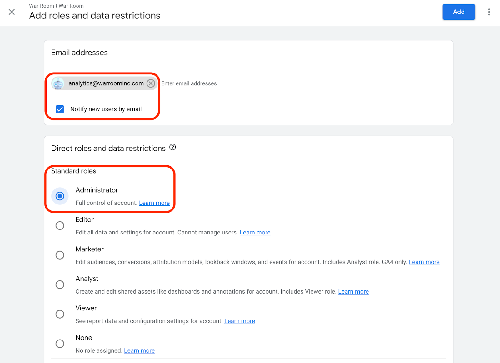 Input analytics@warroominc.com and ensure all boxes are selected: