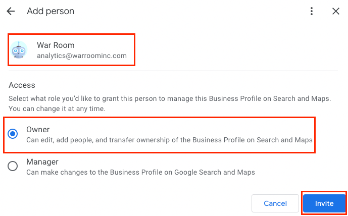 Please add analytics@warroominc.com and select, “Owner” and “Invite.” Finally, select “Done”: