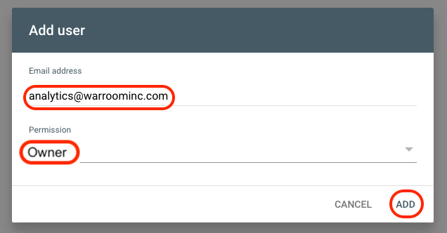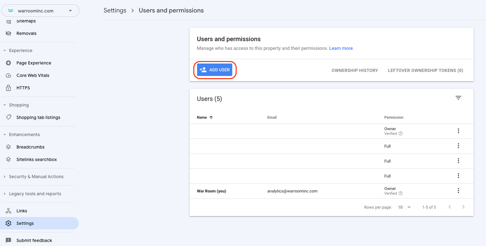 Select your website property at the top Left (example showing as warroominc.com), then “Settings” in the bottom left, and then “Users and permissions”